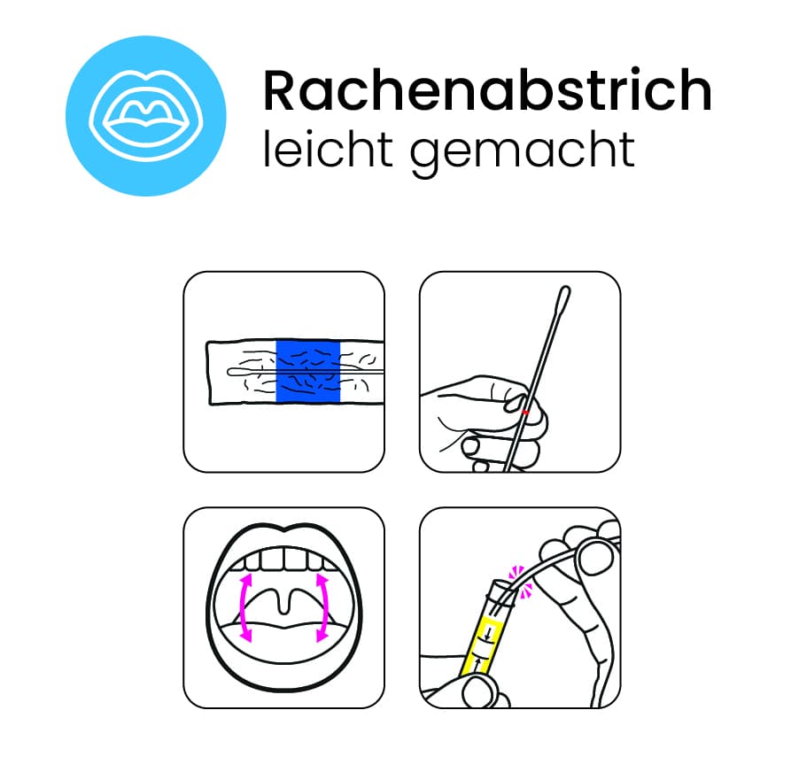 Für den Buccalabstrich den Tupfer mit der blauen Verpackung verwenden und ihn an der roten Markierung festhalten, ohne die Tupferspitze zu berühren oder abzulegen. Den Tupfer zur Probenentnahme in den Mund nehmen und an der Innenseite der Wange einige Male vorsichtig drehen. Anschließend den Tupfer mit der Spitze nach unten in das Röhrchen einsetzen. Zum Verschließen den Tupfer am Rand des Röhrchens um 180° biegen, bis er an der Sollbruchstelle abbricht, gegebenenfalls dabei leicht drehen.