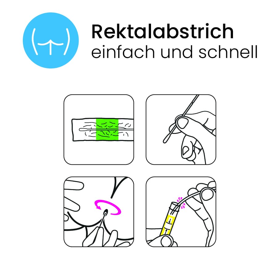 Für den Rektalabstrich den Tupfer der Verpackung entnehmen und an der roten Markierung festhalten, ohne die Tupferspitze zu berühren oder abzulegen. Den Tupfer etwa 2–3 cm tief in den Anus einführen, 2–3 Kreisbewegungen machen und ihn anschließend langsam wieder herausziehen. Danach den Tupfer mit der Spitze nach unten in das Röhrchen geben und ihn durch Biegen am Rand an der Sollbruchstelle abbrechen, gegebenenfalls vorsichtig drehen.